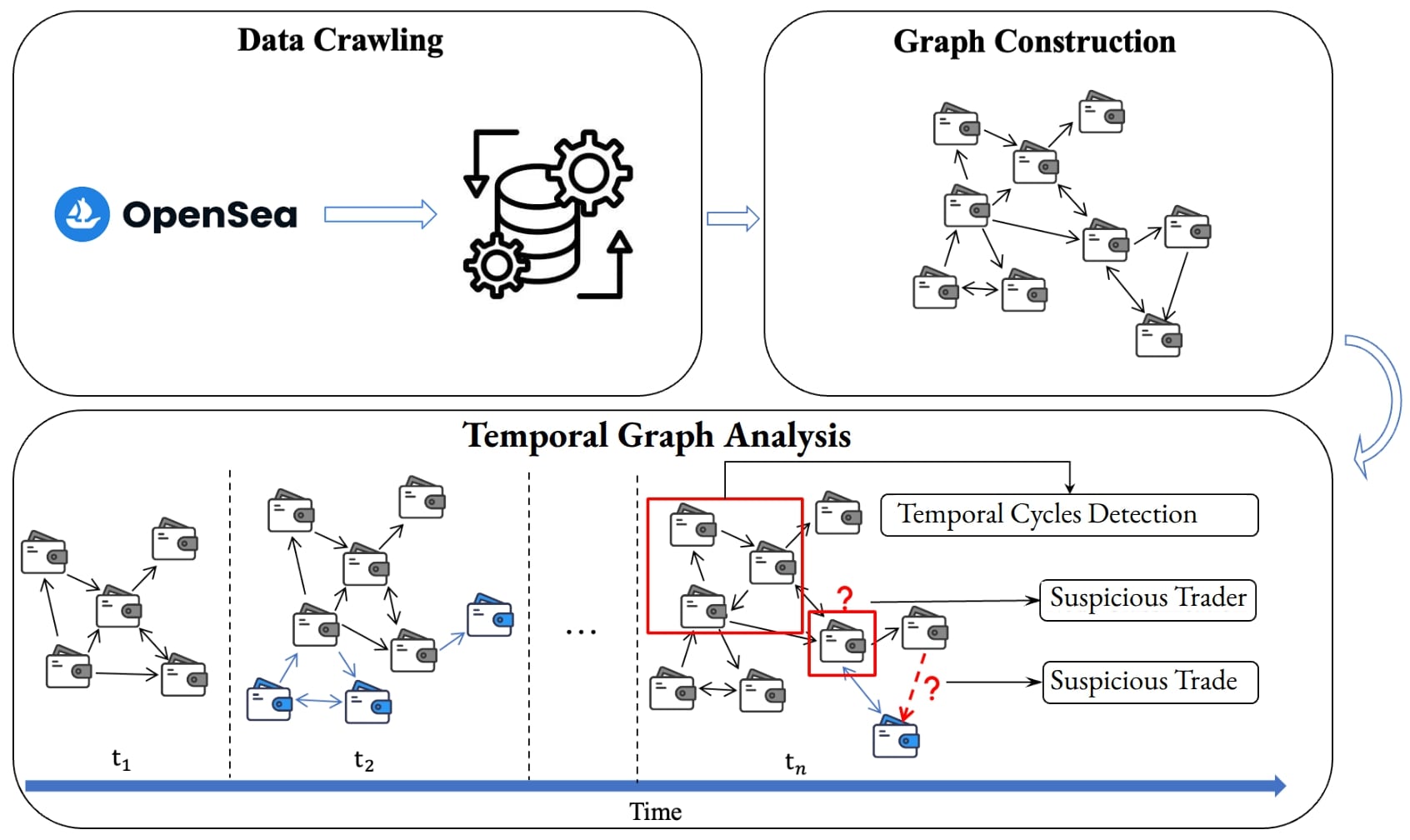 Illicit activities and coordinated manipulations in the Non-Fungible Tokens (NFT) market remain significant concerns, driven by the pseudonymous and publicly transparent nature of blockchain transactions and the lack of market oversight. In this study, we introduce a novel framework for detecting suspicious behavior in NFT trading ecosystems through temporal graph analysis. Our approach represents the market as a large-scale, time-evolving transactional graph, capturing realistic market dynamics and the complex interactions between traders. By leveraging temporal knowledge graphs, we track not only connections between traders but also the evolution of these interactions over time, including their sequence, rhythm, and frequency, enabling the identification of illicit or anomalous behaviors that static graph representations cannot reveal. Using an optimized temporal cycle-detection algorithm, we extract connected groups of wallets for in-depth behavioral analysis, uncovering patterns indicative of unusual or coordinated manipulation. To overcome the absence of labeled ground-truth validation data, we employ a temporal motif–based validation, demonstrating that flagged entities exhibit trading behaviors significantly deviating from standard market dynamics. Our results highlight the potential of temporal graph–based methodologies to enhance surveillance, risk detection, and regulatory oversight in decentralized NFT markets.