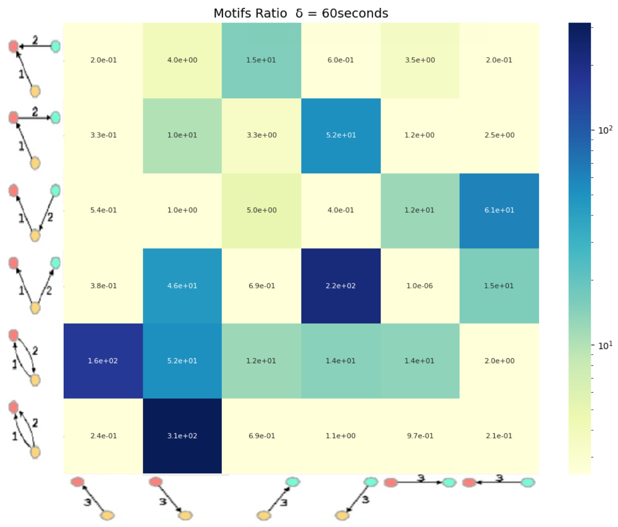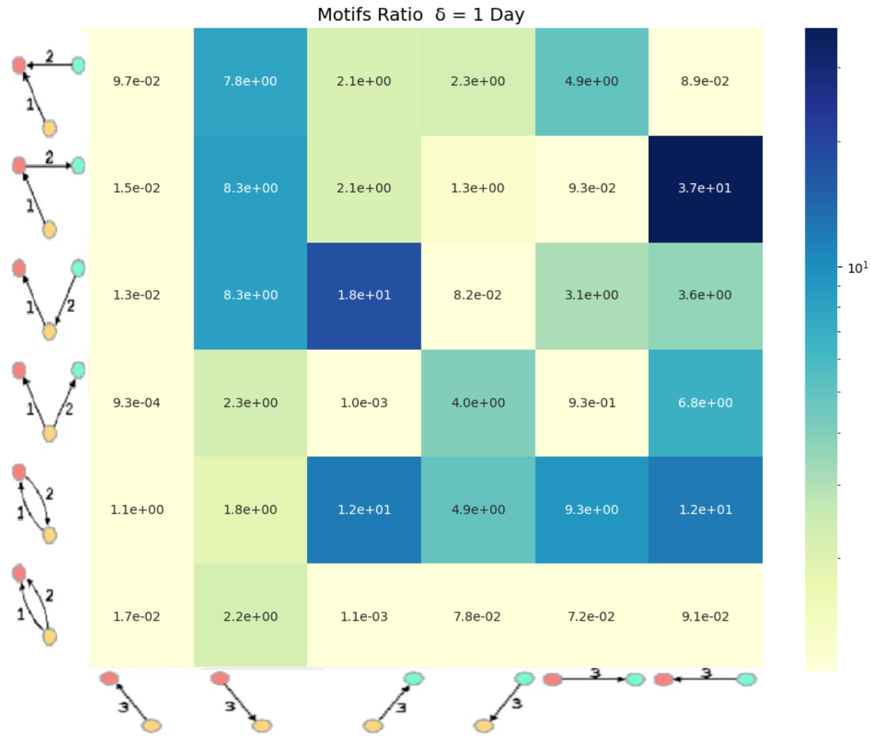 Heatmap showing, for each motif type, the ratio of motifs found in flagged suspicious wallets to those observed in normal wallets. This ratio quantifies how much more (or less) frequently each motif occurs in these flagged wallets compared to the baseline trading population, highlighting the atypical trading behavior they exhibit.