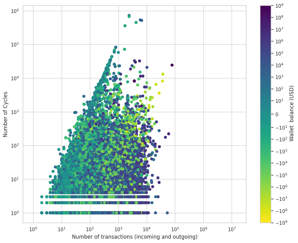 Temporal cycle counts for nodes in the NFT graph with δ = 24 hours and L = 15. The plot shows the total number of temporal cycles versus the total number of transactions (incoming and outgoing). Nodes are colored according to wallet balance (total incoming minus total outgoing transaction value). All axes and the color scale are logarithmic.However, this relationship varies by many orders of magnitude and is highly heterogeneous. For example, a node with around 1,000 transactions may participate in fewer than 10 cycles, while another node with the same transaction count may participate in up to 106 cycles.